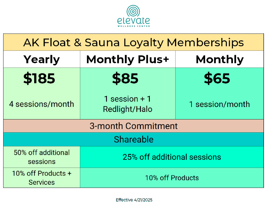 Be loyal to your health and we reward you with savings! Did you know that it takes an average of three floats to enjoy the health benefits of floating? Yes, this is according to the research being done. When clients float (or sauna) consistently, the health benefits increase. Floating is not just a novelty, it is a true therapeutic experience that helps the nervous system get out of fight or flight. It can also be beneficial for individuals struggling with sleep issues, joint/muscle pain, and stress-related health problems.Being alone and quiet with yourself for an hour takes time to get used to, especially if this is not your normal routine! Our loyalty memberships are designed to offer affordable sessions that allow you to find out how floating or saunas can impact your wellness and life. It’s a wonderful opportunity to take time for improving yourself (and your health)!